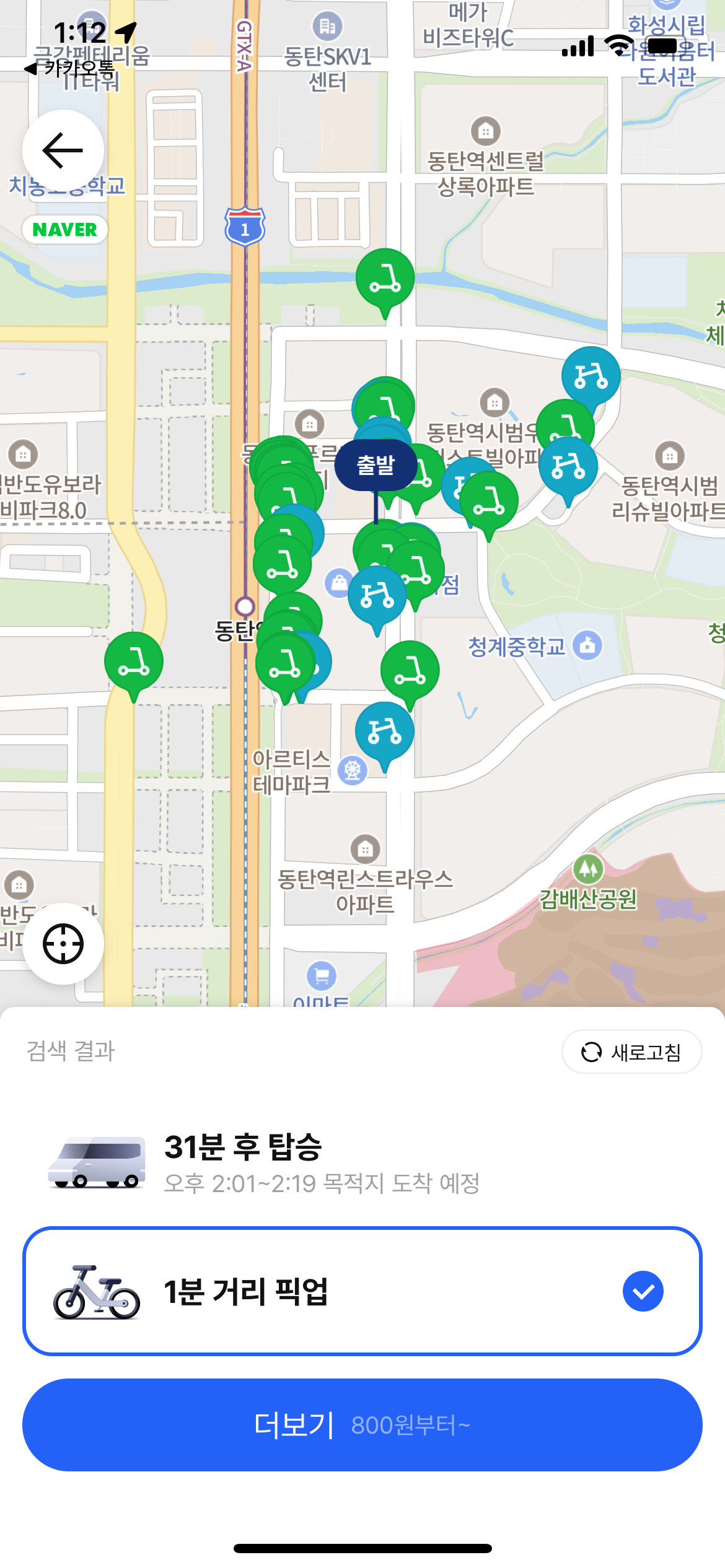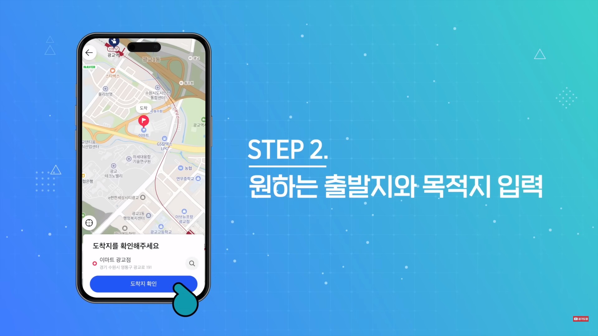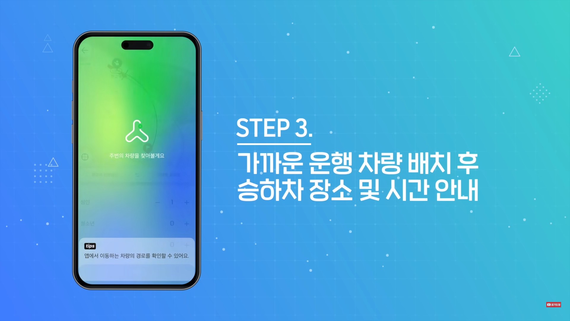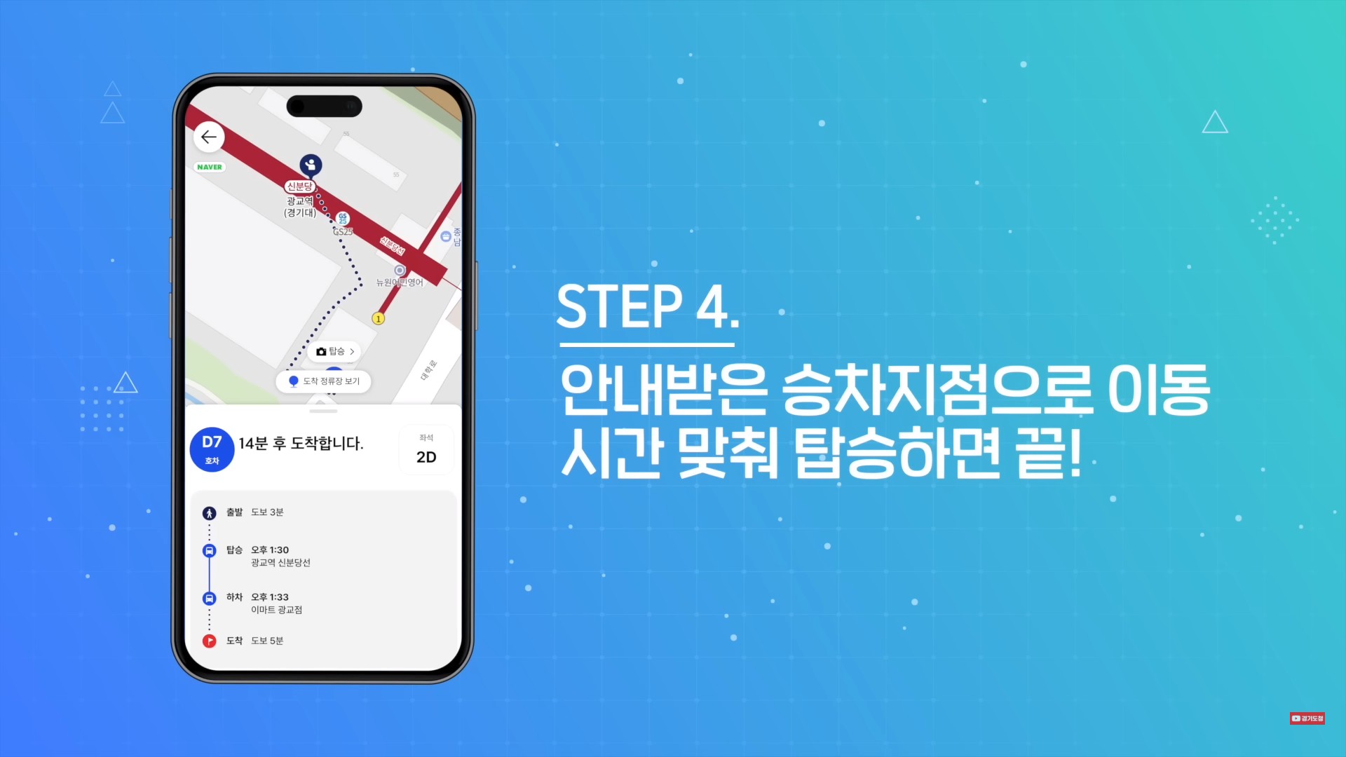 ✔ 정해진 노선이나 배차간격이 없이 실시간 수요와 교통상황을 반영한 경로로 차량을 배차하며, 배차가 어려울 경우에는 주변의 공유 킥보드와 자전거를 안내합니다.