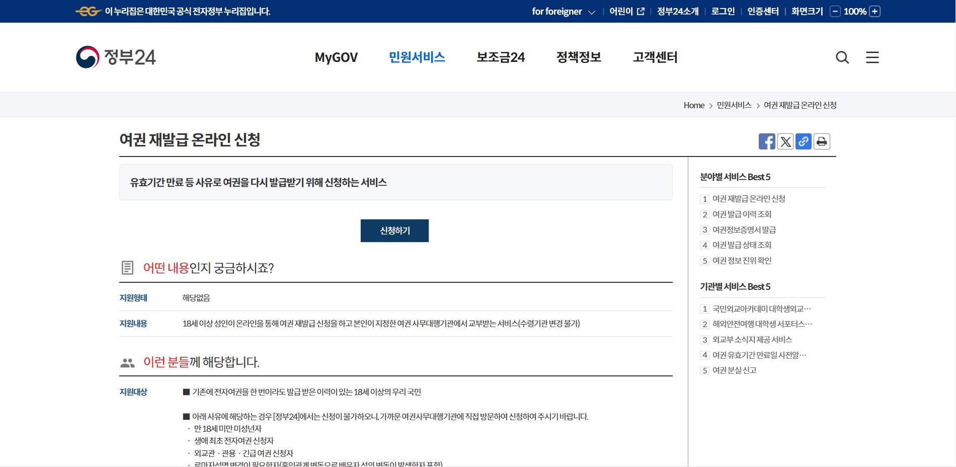 1. 아래 정부24 링크를 통해 여권 재발급 온라인 신청 페이지에 접속합니다.
