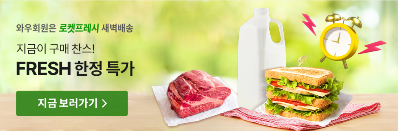 - 로켓프레시 구매 혜택: 신선식품을 할인 금액에 주문하고, 새벽에 받아볼 수 있습니다. 전에는 2만원 이상 주문 가능했는데 지금은 와우회원에 한해 최소주문금액 조건이 사라졌네요 !
